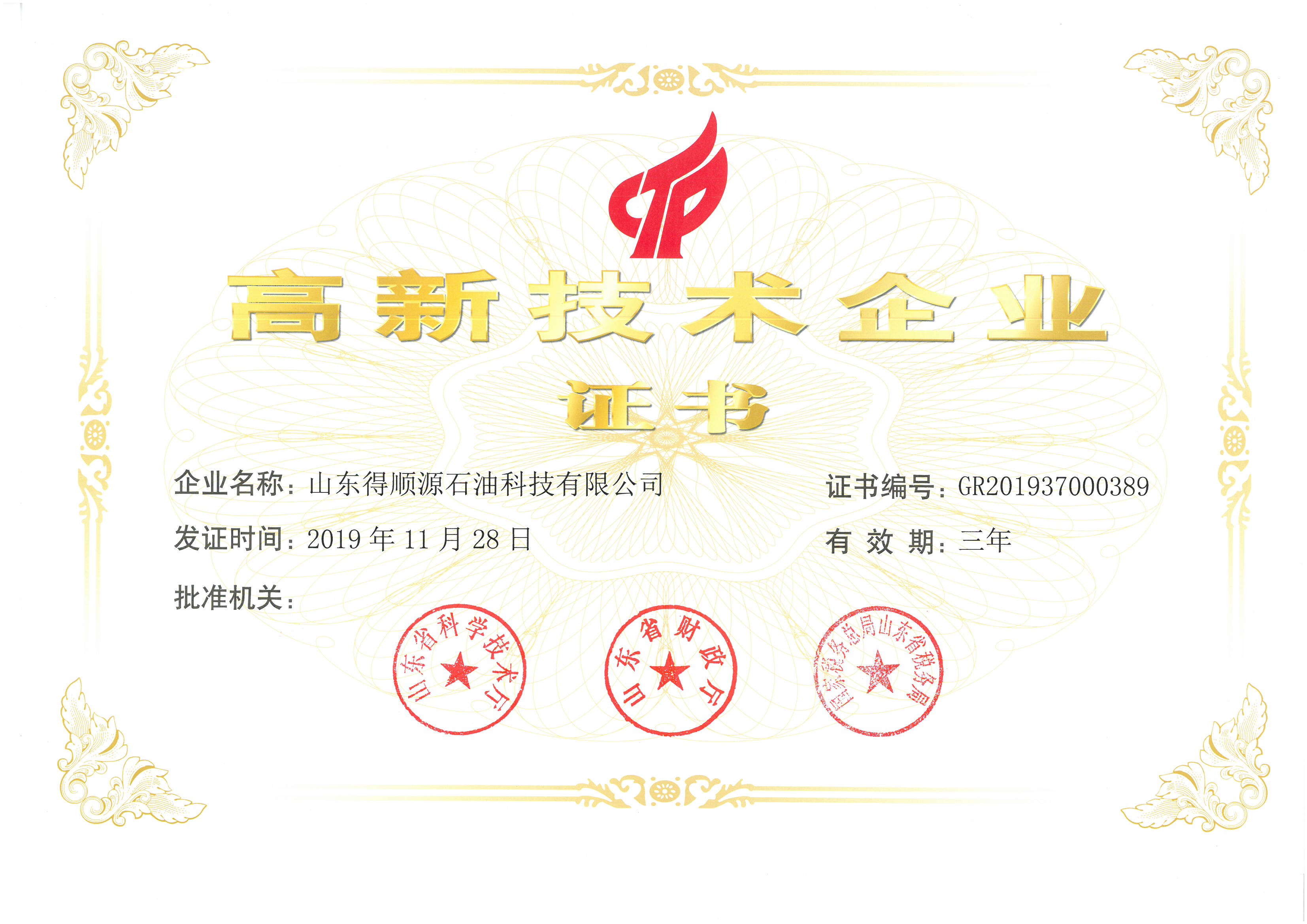 2020年4月30日,我公司顺利通过高新技术企业认定,获得山东省科学技术厅、山东省财政厅、国家税务总局山东省税务局联合颁发的“高新技术企业证书”。